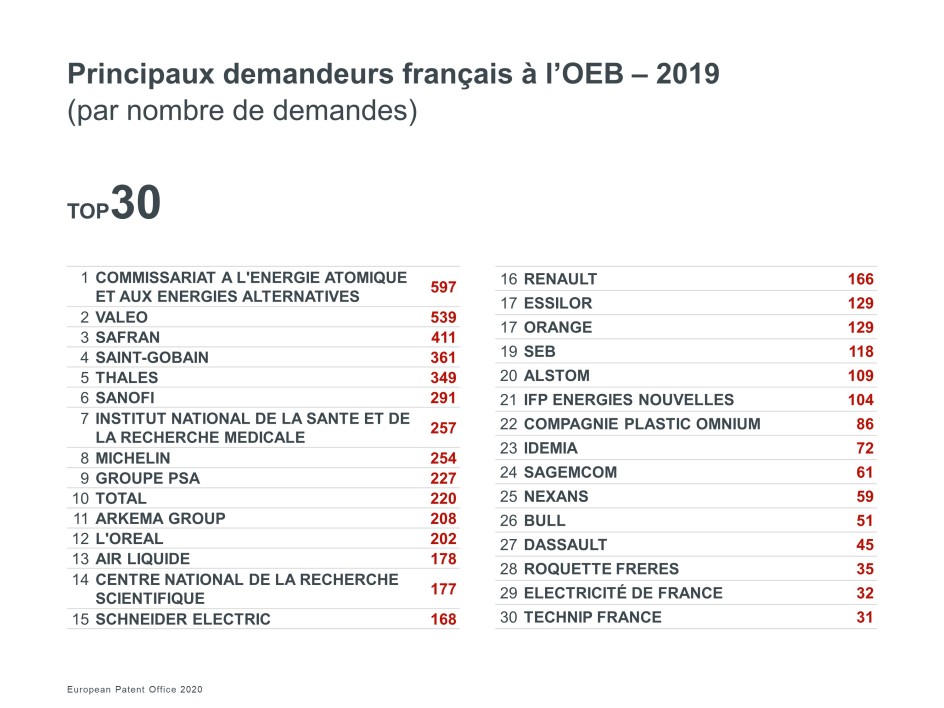Parmi les autres faits notables dans l’innovation européenne en 2019, on note qu’en France, le nombre de demande a baissé de près de 3%. En outre, au classement des entreprises françaises qui déposent le plus de brevets, le Commissariat à l’énergie atomique a raflé la première place à Valeo. Enfin les entreprises qui ont le plus breveté leurs inventions en Europe l’année dernière n’étaient pas européennes, mais asiatiques.