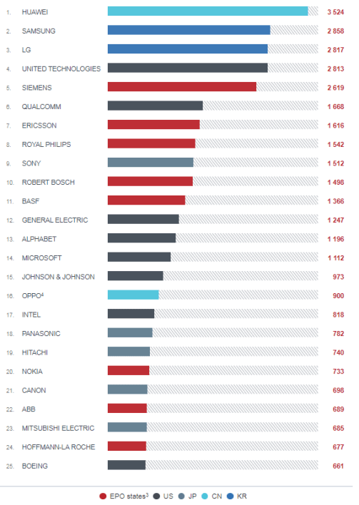 Yann Ménière : Les trois plus gros déposants ont été le chinois Huawei et les Coréens Samsung et LG. Ce baromètre des dépôts révèle en effet une montée en puissance de l’innovation en Asie, notamment en Chine. Jusque-là, le Japon et la Corée étaient de très gros déposants, mais ces derniers mois, on voit la Chine prendre toute sa place. Elle vient justement de dépasser la France au classement des premiers déposants à l’OEB.
