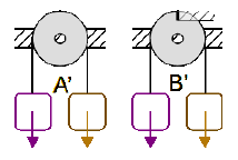 >Pour mettre les poids équilibrés en mouvement, il faut alors appliquer une force sur le poids mauve, égale (ou supérieure) aux pertes mécaniques.
