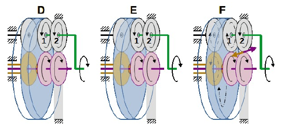 _Si l’axe mauve est menantenu, il mettrait en rotation l’axe vert. La couronne bleue et l’axe orange resteraient inertes. Car les pignons mauves et l’axe vert imposeraient (grâce à l’appui sur la carcasse) aux pignons 1 et 2 la même rotation et le même déplacement. De ce fait la couronne bleue resterait immobile, car la carcasse est immobile.