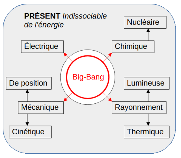 Car c’est bien cette unique énergie, qui par transformations en différents potentiels, retransformés successivement, qui est actuellement présente dans tout l’univers sous différentes formes. Aucune autre énergie n’a été créée ni détruite, au présent.