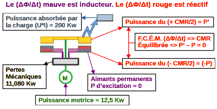 Si le CMR était équilibré sur lui même, la motricité serait égale aux pertes mécaniques nécessaires à la rotation de l’axe de l’alternateur quand il est en charge. Nous constaterions une plus grande facilité au fonctionnement, d’une charge électrique. Car le CMR, serait incapable de s’opposer à la motricité.