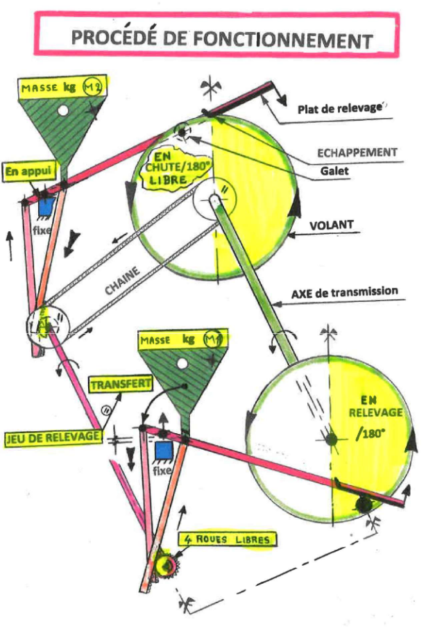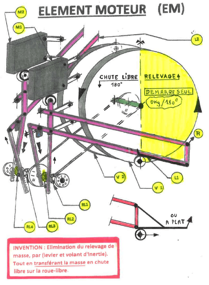 7) L’ENERGIE POTENTIELLE de « pesanteur » sur un élément moteur (EM) est faite par ses deux masses alternées (M1) en transfert, grâce au jeu entre le bâti et le levier plus M2 qui est en chute libre directe car le levier est en appui sur le Bâti = M1+ M2 en chute.