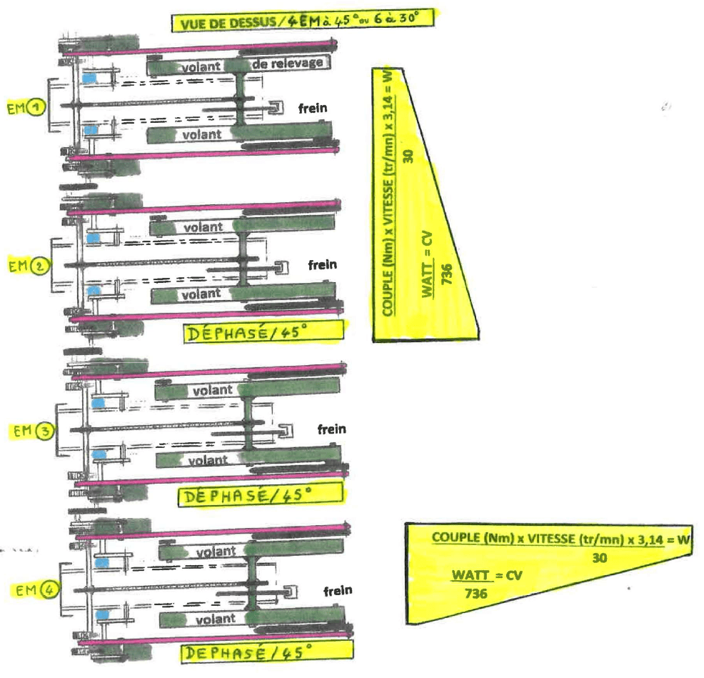 VUE DU DESSUS DE 4 ELEMENTS MOTEURS EN SERIE ET AVEC DEPHASAGE.